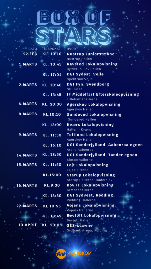 Alt fra bane- og trampolinspring til rytmiske sekvenser af både drenge og piger. Vi laver også fællesserier, hvor både drenge og piger er på gulvet på samme tid. Hele opvisningen tager vi ud og fremviser til forårsopvisniger rundt omkring i landet i marts og april måned.